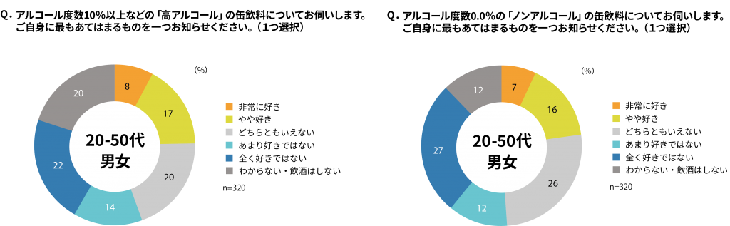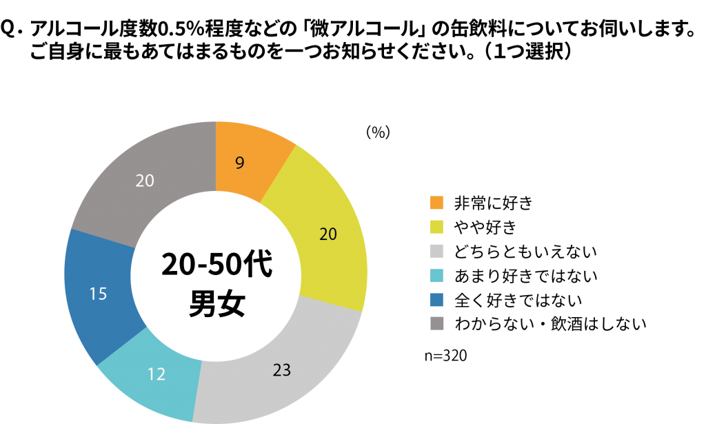 昨今、「アルコールの度数」にかかわる商品ラインナップは大きく拡販され、消費者の選択はよりパーソナライズされています。今回は、そんなアルコール飲料における「高アルコール・微アルコール・ノンアルコール」といった3種類にフォーカスし、20~50代の男女へ、それぞれの好意度を比較調査しました。