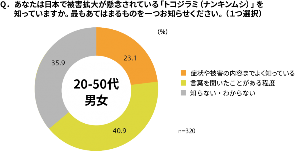 まず「トコジラミ(ナンキンムシ)」の認知率は全体の約6割程に。その中で「症状や被害の内容までよく知っている」人は全体の約2割程に留まりました。
