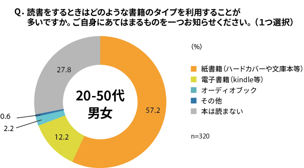 半数以上は紙媒体(ハードカバーや文庫本等)で読書をしている習慣がわかります。一方で、電子書籍やオーディオブック等の電子コンテンツの利用は1割程度のようです。