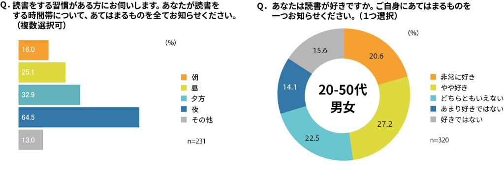 続いて、普段読書をする習慣があると回答しているモニターへ「読書する時間帯」について調査。最も多い時間帯は「夜」と分かります。(約6割)帰宅後リラックスタイムなどに読書する人が多いのでしょうか。