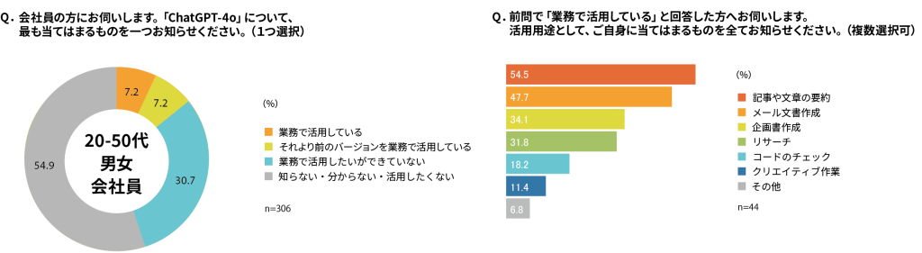 次に、ChatGPT-4oを実際に活用しているかについてですが、現在の利用率はまだ1割未満のようです。「ChatGPT」を使用している人を含めても、業務での活用率はかなり低い状況です。