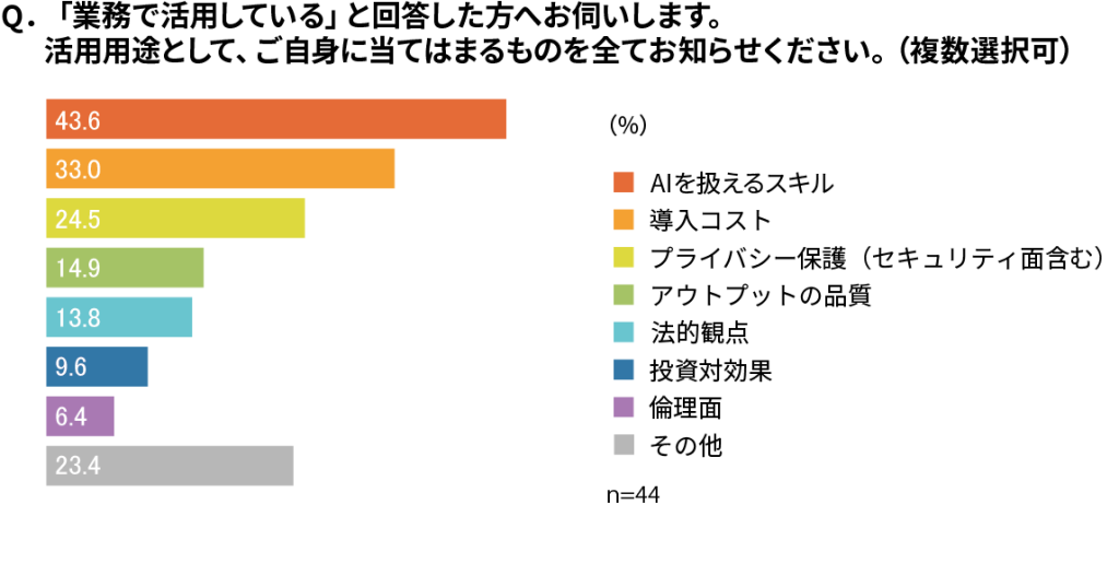 まず、ChatGPT-4oの業務活用に関する障害について。約4割の回答者が、AI技術の活用に必要なスキルが十分にないと回答しました。