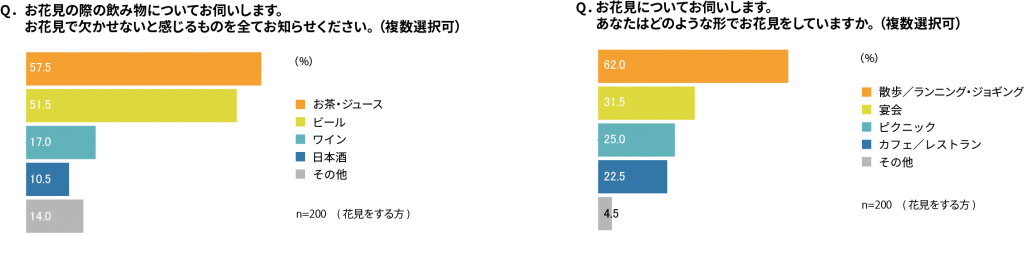 なお、花見をする方法も「宴会」に比べ「散歩/ランニング・ジョギング」が上回り、「花見=宴会」というイメージは変化していることが伺えます。