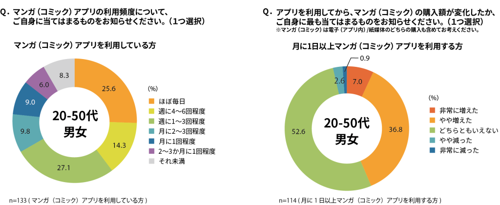 以上の調査結果から、マンガ(コミック)アプリの利用者は全体の約4割であり、その内6割強が「週に1回以上」アプリを利用していることが明らかになりました。また、アプリの利用によって約4割の回答者がマンガ(コミック)の購入額が増えたと感じており、アプリの利用が購買行動に一定の影響を与えていることが分かりました。
