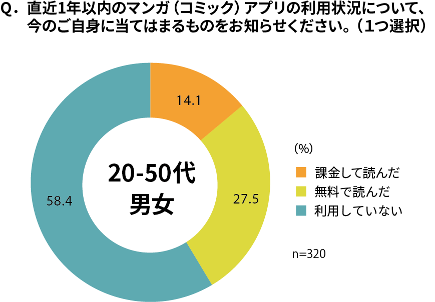 まず、マンガ(コミック)アプリの利用状況について調査したところ、全体の約4割(41.6%)がアプリを利用していることが分かりました。そのうち、課金をして購読した人は14.1%、無料で読んだ人は27.5%でした。一方で、マンガ(コミック)アプリを利用しない人も全体の半数以上を占める結果となりました。