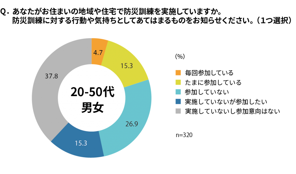 次に住まいの防災訓練への参加を伺ったところ実施率は約半数であり、「参加していない」が最も多く「毎回参加している」は僅か5%と参加率の低さが伺えました。