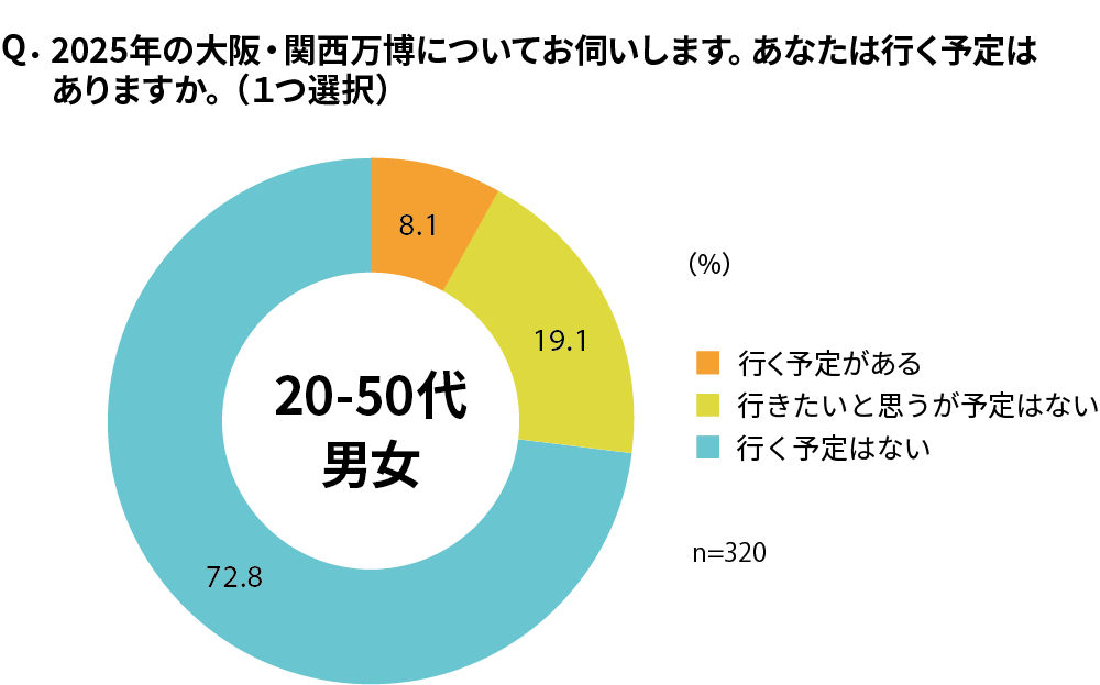 そもそも「大阪・関西万博に行きたい、行く予定がある」方がどの程度いるか確認したところ、7割以上が「行く予定はない」と回答。