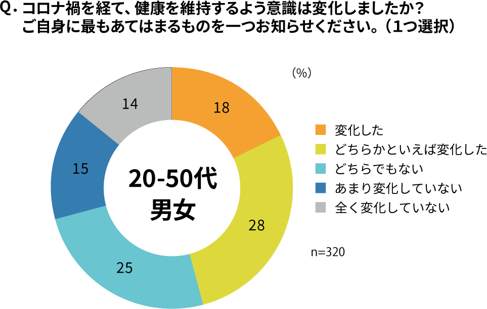 私達の生活様式を大きく変化させた新型コロナウイルス。コロナ禍を経て、人々の「健康維持」へ意識は、約半数が「変化した、どちらかといえば変化した」と回答しました。