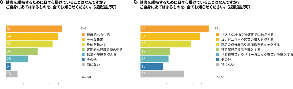 また「健康維持」の為に日々心掛けていることについて調査すると、「健康的な食生活(約64%)」「十分な睡眠(約60%)」「身体を動かす(約52%)」という結果でした。