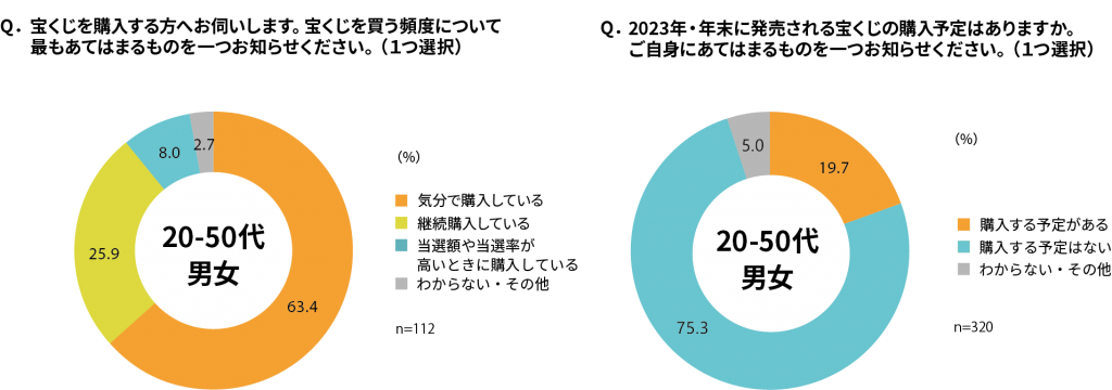 また、宝くじ購入者へその「購入頻度」について調査したところ、継続購入者が2割強である一方、「気分で購入している」割合が6割程という結果に。