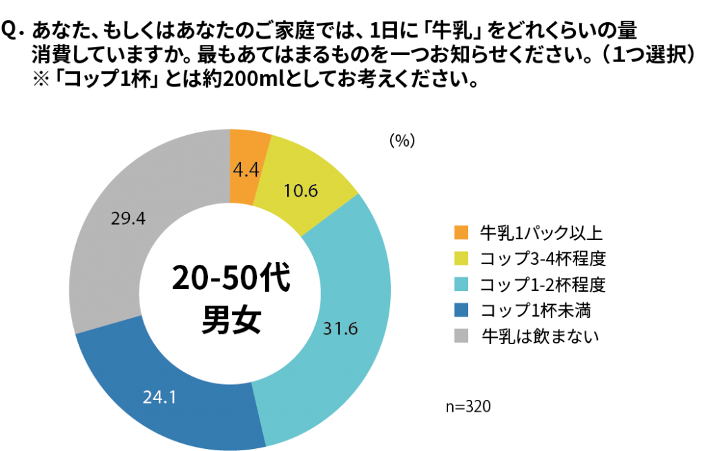 まず、1日の牛乳摂取量について調査したところ、約半数がコップ一杯以上の牛乳を毎日飲んでいることが判明。