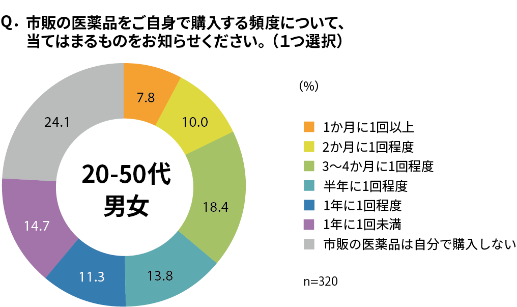 まず、市販薬の購入頻度について調査したところ、回答にばらつきが見られたものの「1か月に1回以上~半年に1回程度」の頻度で購入する層が全体の半数を占める結果となりました。中でも、「3~4か月に1回程度」購入する人の割合が最も高いことがわかりました。一方で、市販薬をほとんど購入しない層も一定数存在することが確認されました。
