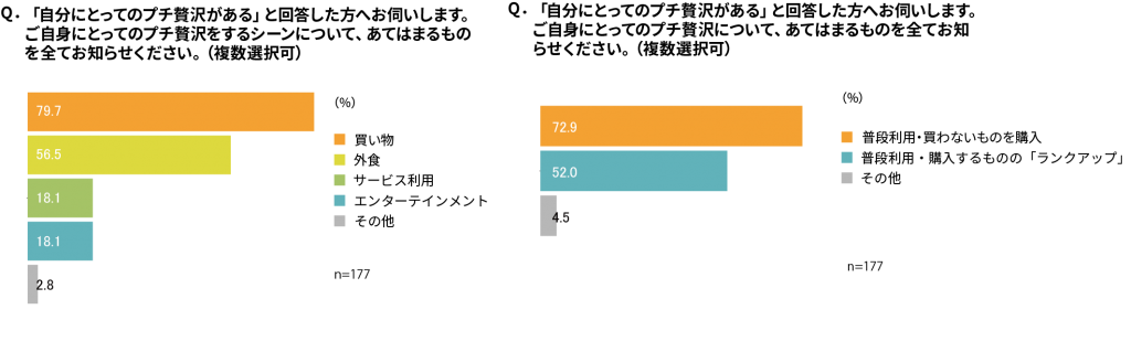続いて、プチ贅沢のシーンについては、 買い物 約8割、外食 約6割が多くを占めていることが分かりました。