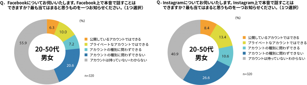 Facebookでは本音で話すことは難しいと考える人が多いようです。なお、回答者の約6割は「アカウントは持っていない・わからない」と回答していることも他2つのSNSとの目立った相違点でしょうか。