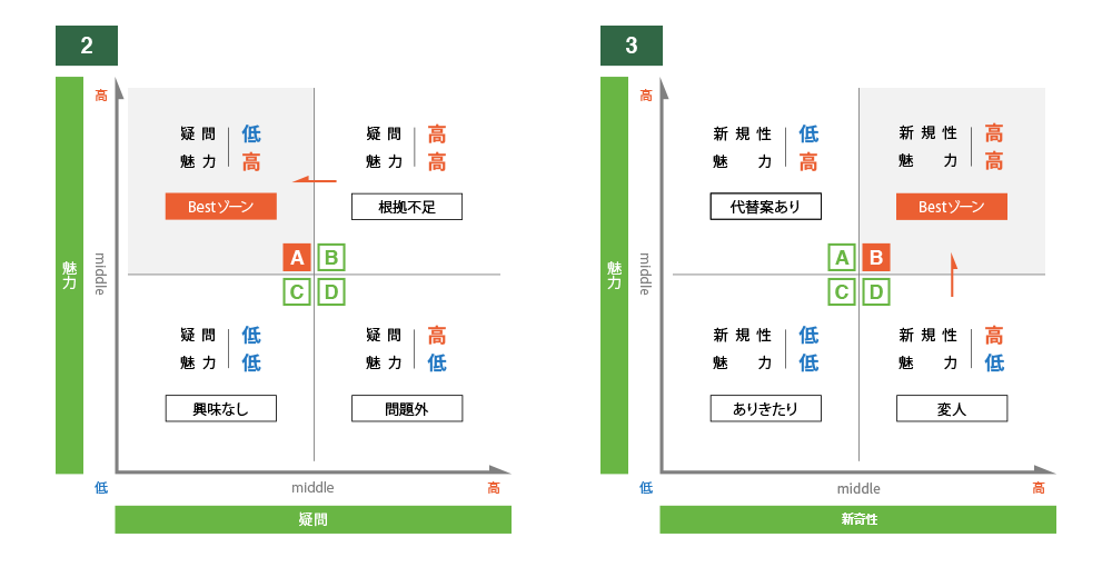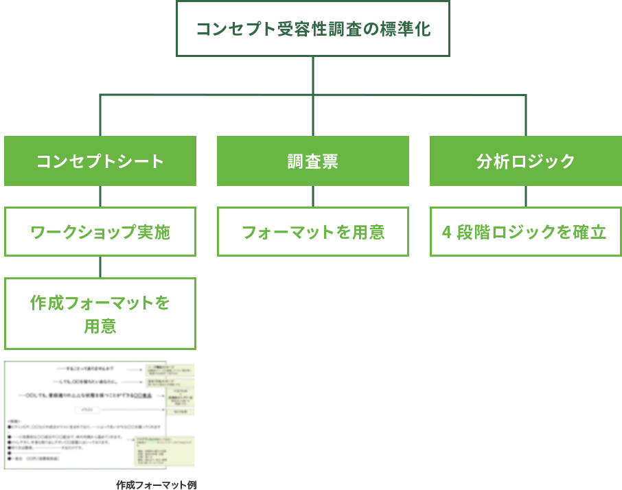 部署や担当者によって異なっている調査のフレームを標準化するためのコンセプト受容性調査に特化したパッケージです。 コンセプト開発調査ではないので、ベストなコンセプトにすることは難しいですが、ベターなコンセプトへ導くことができます。 どのコンセプトが受容されるのか、受容されない場合、どのように改良すればよいのか?受容される場合、どのようにすればもっと確度が高まるのか?が分かります。