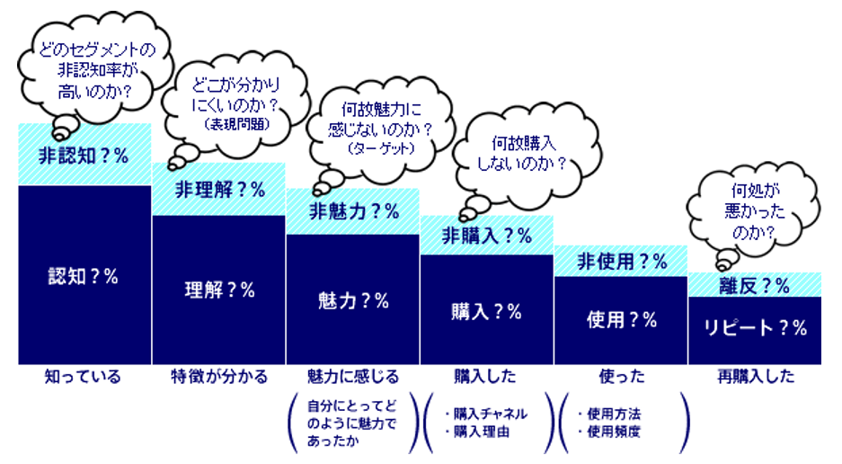 STEP2にあわせることで、商品認知からのプロセスに沿った浸透状況と、その事象の理由がひととおり把握できる