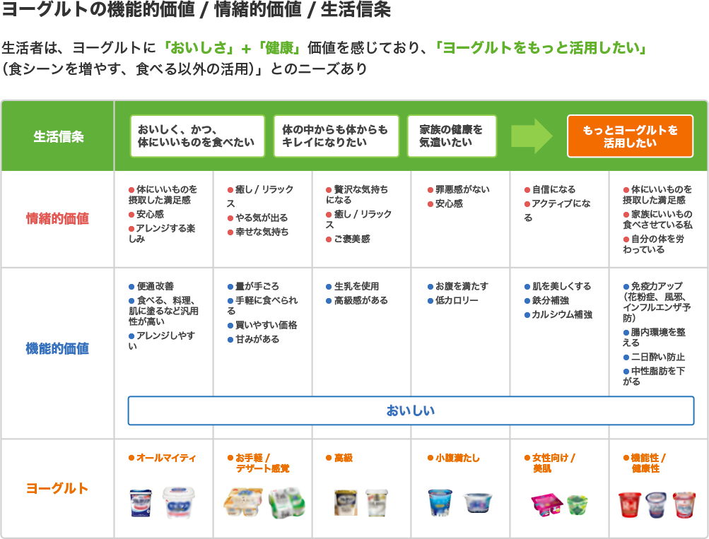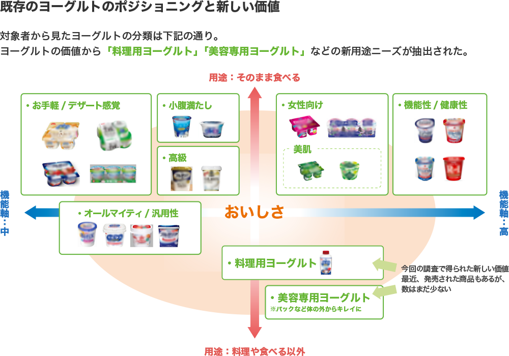ブランドへのポジショニングは、消費者意識や特徴から、喫食面で『オールマイティ』『機能性タイプ』『高級タイプ』などへの区分がなされる。しかし、ヨーグルトそのものに対する喫食利用を主としており、『料理』や『美容(パックなど)』に対するホワイトスペースが見られる。