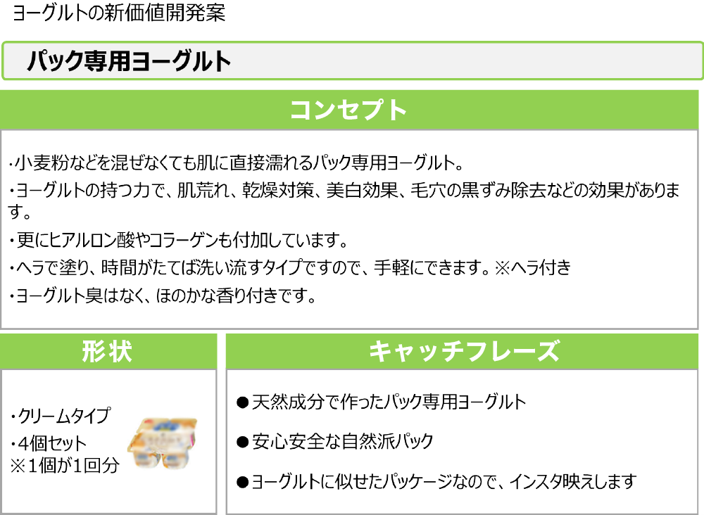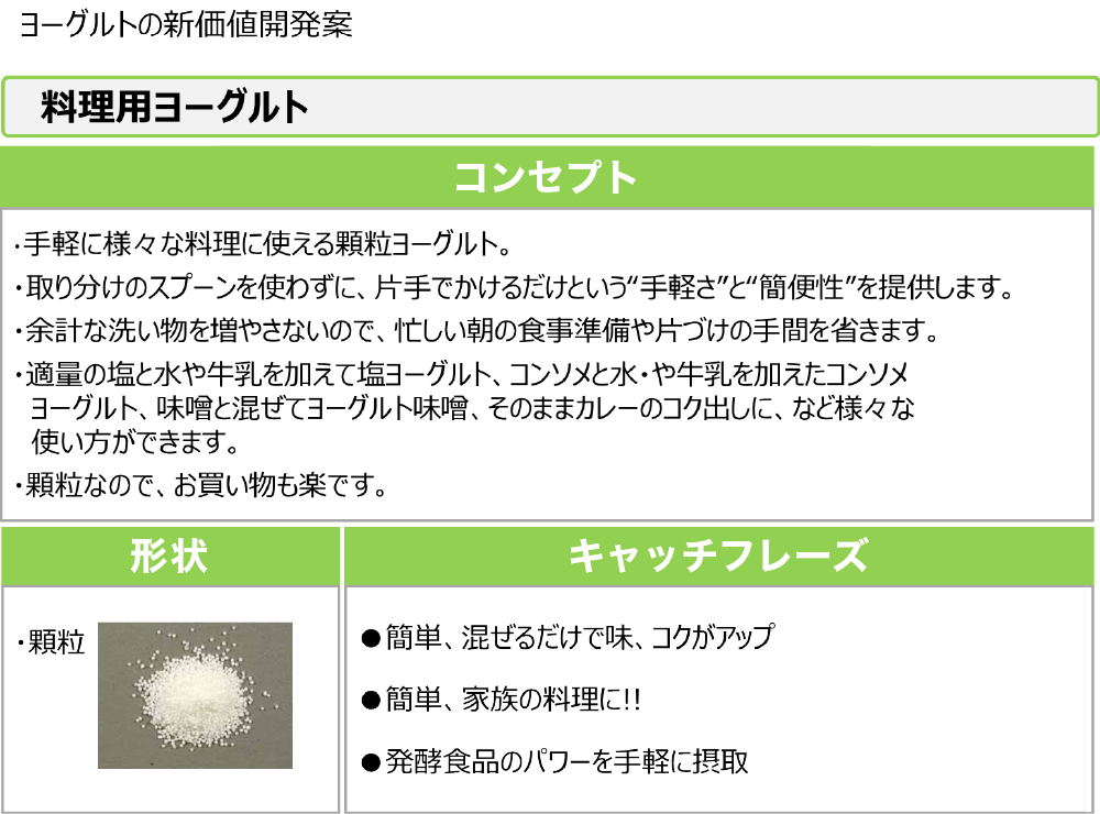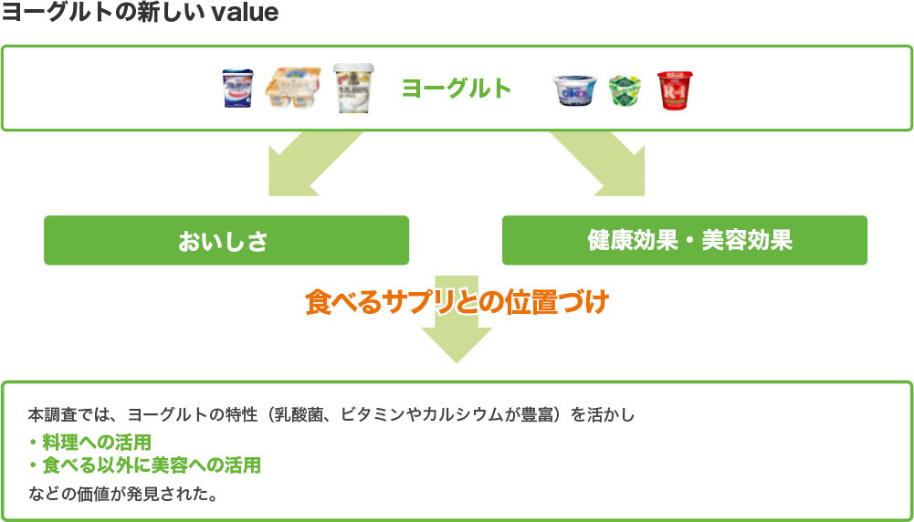 ヨーグルトの特性(乳酸菌、ビタミンやカルシウムが豊富)を活かした『料理』『食べる以外に美容』への新用途ニーズが示唆される。