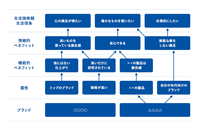 「なぜこの商品はあなたにとって価値があるのか」という質問を繰り返し、商品やブランドの持つ価値と消費者の求める価値を結び付けていく手法