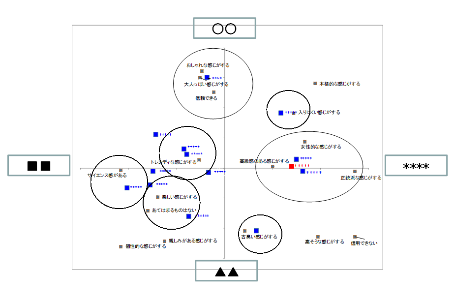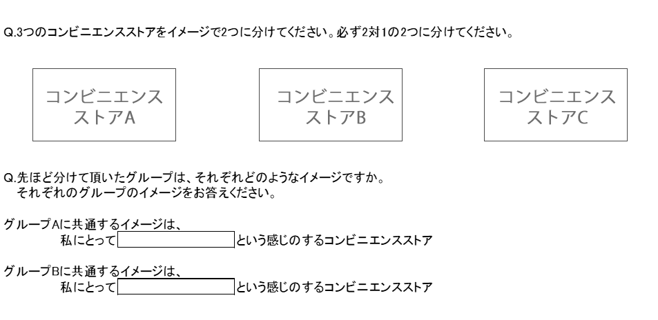 3つのブランドを2つに分けてもらい、そのコントラストからイメージの微細な差異まで抽出することにより、競合との差別化要因となるブランド連想を抽出する。(自由回答)