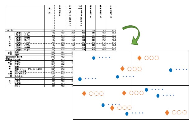 集計済みのクロス表を用いて、表側と表頭の相関を可視化します。 回答傾向が似ているものが近くにプロットされるので、自社と競合のポジションを確認することができます。 ただし、サンプルサイズの大小(ユーザー規模等)は反映されません。