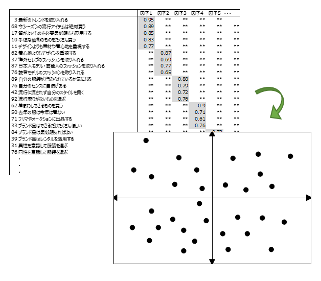 相関関係の強い変数の集合を作り、共通する特性を探る手法です。 それぞれの背景にある潜在的な要素を原因を探って理解します。 また、因子分析によって得られた第一因子と第二因子の因子得点をプロットすることで、ポジションを確認することもできます。
