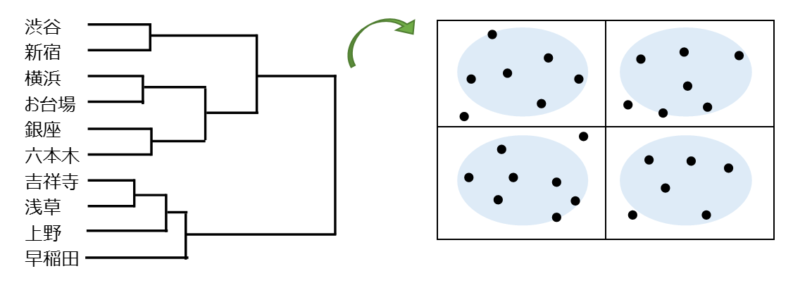 データの類似性に基づいて、対象を比較的似ているグループに分ける手法です。 大別すると階層的手法と非階層的手法の2種類があります。