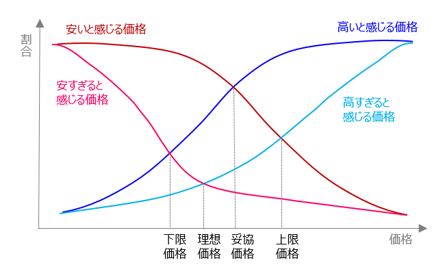 以下の4つの定型的な質問回答から、4つの判定点*と受容価格帯を知ることができます。